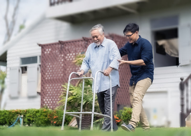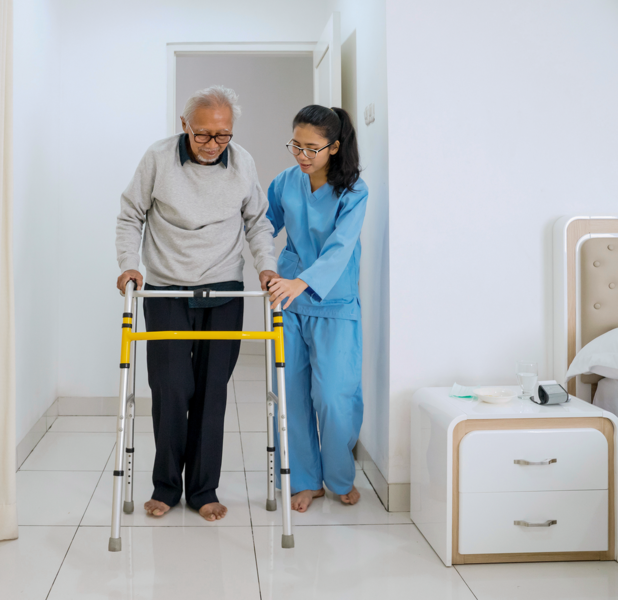 - Ensure clients use grab bars, railings, or their walker when moving around.